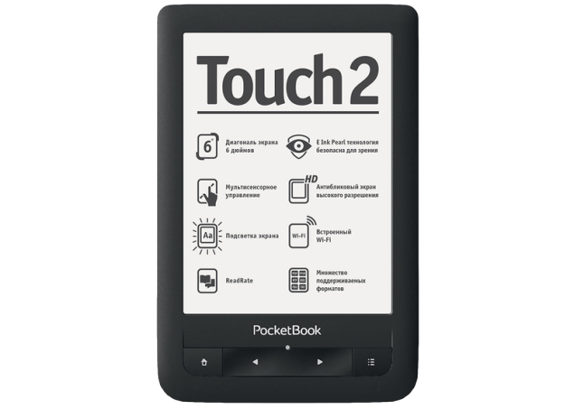 Компанія PocketBook представила нову модель електронної книги, що характеризується сенсорним екраном з підсвічуванням - Touch 2. Сам дисплей новинки має діагональ шість дюймів і роздільною здатністю 1024х758 точок. Він підтримує мультитач і дуже швидко для дисплея E-Ink перемальовує текстові сторінки.