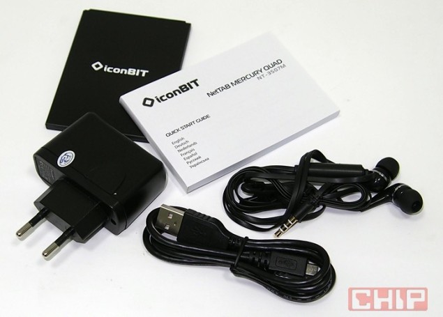 В комплект поставки пристрою, крім вже згаданої захисної плівки, входить кабель micro USB, композитний, зарядний пристрій, простенькі навушники-вкладиші і керівництво користувача.