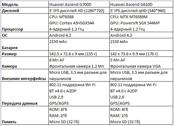 Компанія Huawei запропонувала споживачеві на вибір функціональні особливості новинок: Huawei Ascend G700D володіє великим HD IPS дисплеєм, 8-мегапіксельною камерою, 1.3 мегапіксельною фронтальною камерою, 2 Гб оперативної пам'яті і 8 Гб пам'яті для користувача; Huawei Ascend G610D оснащений великим qHD IPS дисплеєм, 5-мегапіксельною камерою і фронтальною VGA камерою, 1 Гб оперативної пам'яті і 4 Гб пам'яті для користувача.