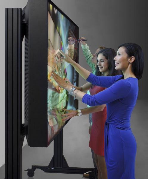 Використовувати панель можна як в горизонтальному, так і у вертикальному положенні: у другому випадку спеціальна підставка на коліщатках забезпечить можливість переміщення. А кілька таких дисплеїв можна об'єднати в інтерактивну стіну великого розміру.