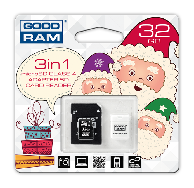 Польський виробник комп'ютерної пам'яті представив нову праздничую серію 3 in 1, яка включає в себе карту мікро, адаптер SD і USB кардрідер. Завдяки GOODRAM 3 in 1 карту мікро можна легко перетворити в стандартну карту SD а також в мініатюрну флешку. Треба лише вставити карту мікро в адаптер або кардрідер, щоб швидко перенести улюблену музику, фотографії і важливі документи на відеокамеру, ноутбук і навпаки.