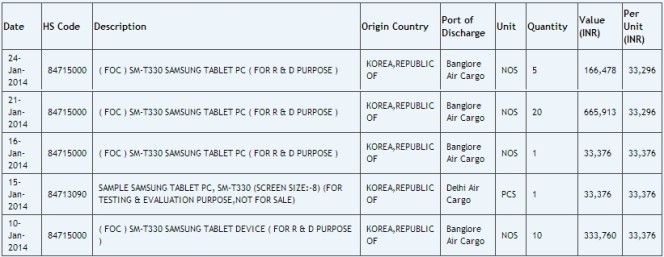 Дана модель вже засвітилася в індійській базі даних експорту-імпорту Zauba. Передбачається, що новинка з'явиться на ринку під назвою Galaxy Tab 4 8.0. Крім того, пристрій, швидше за все, отримає дисплей AMOLED, хоча достовірних даних про характеристики поки немає. Цілком можливо, що Samsung продемонструє нові планшети в рамках виставки MWC 2014.