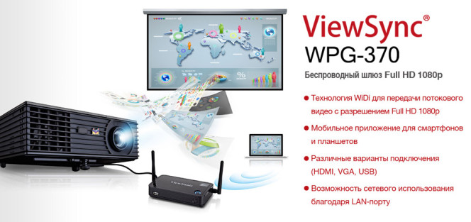 Бездротовий шлюз ViewSync WPG-370 дозволяє забезпечити бездротову передачу даних на дисплей з настільного ПК, ноутбука, планшета або смартфона. Шлюз може бути підключений до дисплею, встановленим будинку, в навчальному закладі або у громадському місці. Проста передача контенту можлива з пристроїв під управлінням Windows, Mac, iOS і Android.