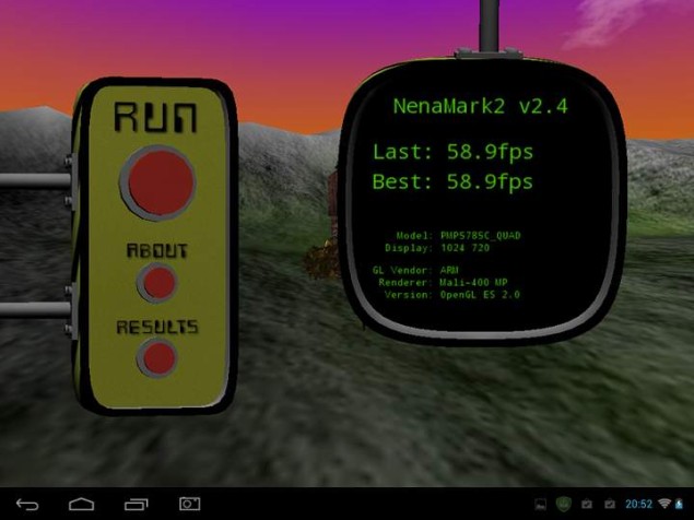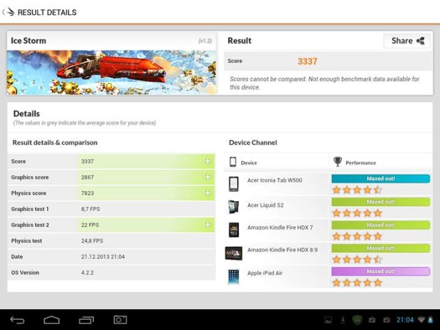 3D-тест NenaMark2 для MultiPad 4 QUANTUM 7.85 пройшов з результатом 58,9 кадрів/с.3D-тест 3DMark mobile для MultiPad 4 QUANTUM 7.85 пройдено з результатом 3337 балів.