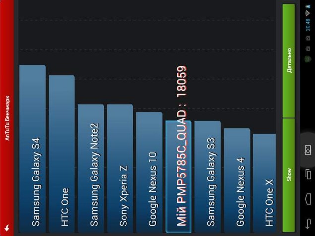 Продуктивність планшета в цілому характерна для використаної платформи, і оскільки MultiPad 4 QUANTUM 7.85 далеко не перший планшет з платформою Rockchip, що потрапив до нас у руки. В цілому про можливості пристрою можна було розповісти ще й до тестів, а їх результати - передбачити з неабиякою часткою впевненості. Так і сталося. Планшет впевнено справляється з самими завданнями на зразок перегляду фото високої роздільної здатності, відео, іграми, веб-серфінгом, але говорячи мовою сухих цифр, результати тестів виявилися трохи нижче середньостатистичних показників для схожих пристроїв з SoC RK3188.