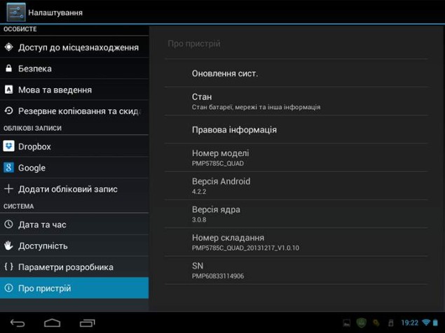 Планшет працює під управлінням операційної системи Android 4.2.2 Jelly Bean.