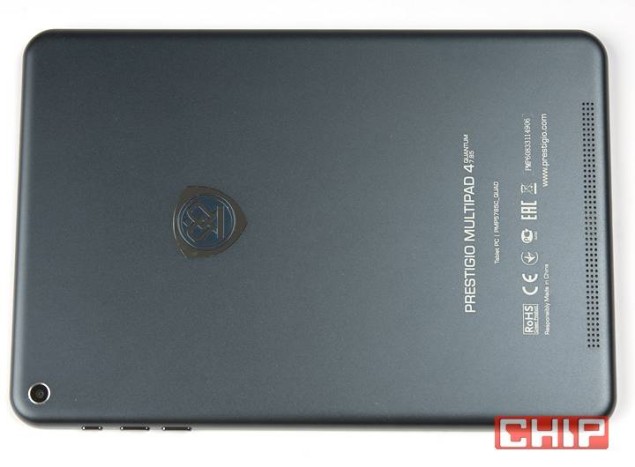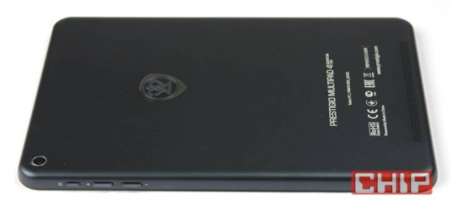 На правій бічній поверхні розмістилася кнопка живлення і пара округлих клавіші для регулювання гучності. На верхньому торці розміщені порт micro HDMI і стандартний роз'єм для навушників, отвір мікрофону, нічим не прикритий слот для карт пам'яті microSDHC. Модель MultiPad 4 QUANTUM 7.85 - перший планшет від Prestigio, де використаний порт micro HDMI, інші пристрої використовують більш габаритний роз'єм mini HDMI. На нижній бічній поверхні прямо по центру розміщений порт micro USB 2.0, це дуже правильно, оскільки сплутати його з micro HDMI не становить великої праці. Динамік розміщений знизу практично на всю ширину корпусу.. Прихованої кнопки для апаратного скидання не передбачено.