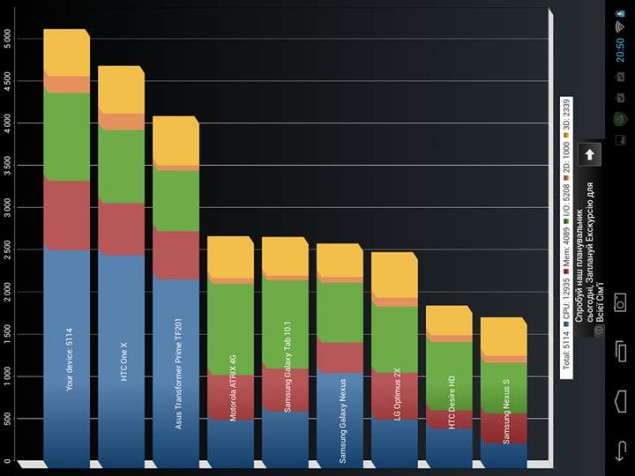 Втім, це можна сказати і про всіх представників лінійки MultiPad 4-ядерного покоління. Одна з особливостей чіпа Rockchip RK3188 - можливість підняти частоту до 1,8 ГГц при наявності ROOT-доступу і отримати істотну надбавку продуктивності. Проте в розігнаному вигляді планшет неслабо гріється і безсовісно швидко «їсть» батарею. Виробник встановив лише 8 Гбайт вбудованої пам'яті і трохи заощадив, так що без ємною карти пам'яті micro SDHC (до 32 Гбайт) не обійтися. Цікаво, що деякі тестові утиліти визначають, що в планшеті використовується двухгигабайтный модуль ОЗП, в якому працює тільки один гігабайт, але, швидше за все, це просто баг самих системних бенчмарків.Планшет обладнаний двома камерами - фронтальною 0,3 Мегапікселя, і основний з роздільною здатністю в два мегапікселі. Скромними дозволами обох сенсорів виробник прямо натякає, що планшет - жодного разу не інструмент для фотозйомки.